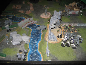 Since he was set up pretty far forward, and in the middle, I knew that I was going to have to split up and make him walk to the corners I wanted as many turns as possible to shoot at stuff before he was in assault range and the kill point bonanza would begin. Fortunately he left me that little corner that had the water cutting across it (difficult/dangerous) so that would be an ideal place to make a stand since terrain could cause some wounds. My HQ and his bodyguard were put there.